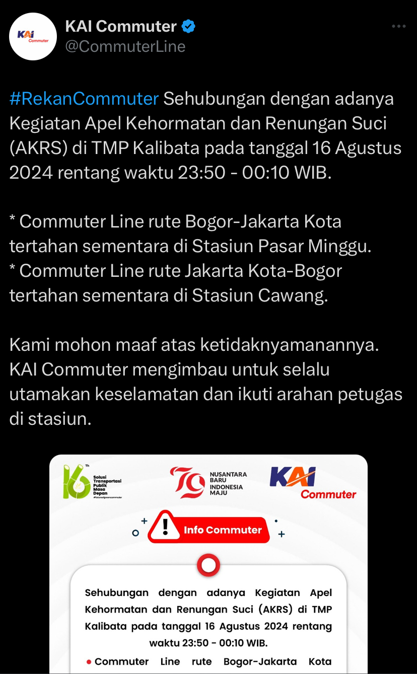 “Kami mohon maaf atas ketidaknyamanan ini. Sehubungan dengan adanya Kegiatan Apel Kehormatan dan Renungan Suci (AKRS) di TMP Kalibata pada tanggal 16 Agustus 2024 dalam rentang waktu 23:50 – 00:10 WIB,” demikian dikutip dari akun resmi X, KAI Commuter pada Jumat (16/8/24).
