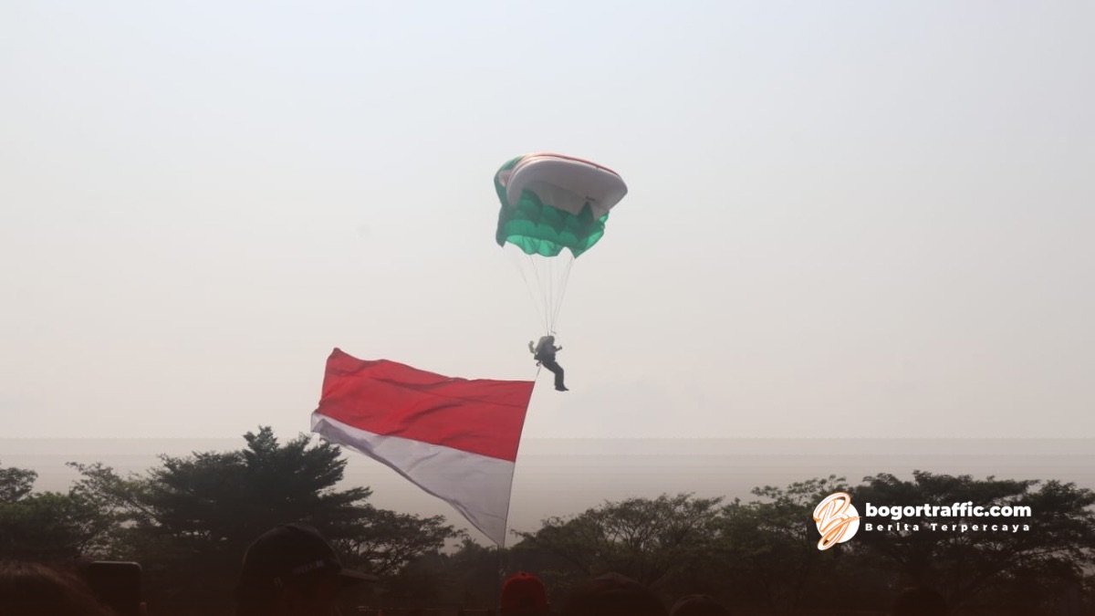 Para penerjun payung membawa bendera merah putih, bendera Kabupaten Bogor, dan bendera Koni Kabupaten Bogor, yang menjadi tontonan yang memukau bagi masyarakat setempat.
