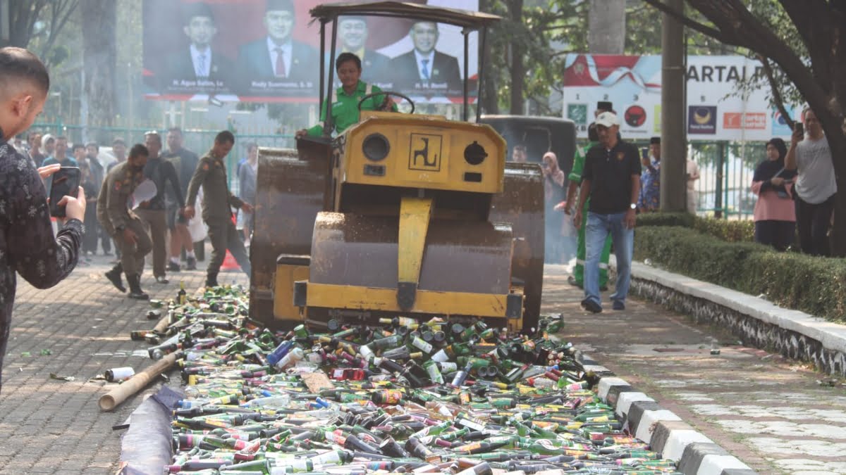 KABUPATEN BOGOR – Bertepatan dengan Peringatan Hari Kesaktian Pancasila, Bupati Bogor Iwan Setiawan dan Forum Koordinasi Pimpinan Daerah (Forkopimda) melakukan pemusnahan sekitar 6.000 botol minuman keras hasil operasi gabungan Nongol Babat (Nobat) di halaman Gedung Tegar Beriman pada Minggu (1/10/23).