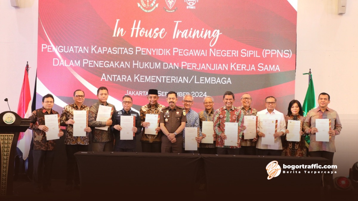 bogortraffic.com, JAKARTA – Kementerian Agraria dan Tata Ruang/Badan Pertanahan Nasional (ATR/BPN) bersama 12 kementerian/lembaga (K/L) lainnya melangsungkan penandatanganan Perjanjian Kerja Sama dengan Kejaksaan Agung Republik Indonesia, Selasa (03/09/2024). Kerja sama ini tentang Penguatan dan Sinergitas Penyidik Pegawai Negeri Sipil (PPNS) pada K/L terkait. Sekretaris Jenderal (Sekjen), Suyus Windayana menyebut perjanjian ini akan menjadi pedoman kerja sama bagi kedua belah pihak.